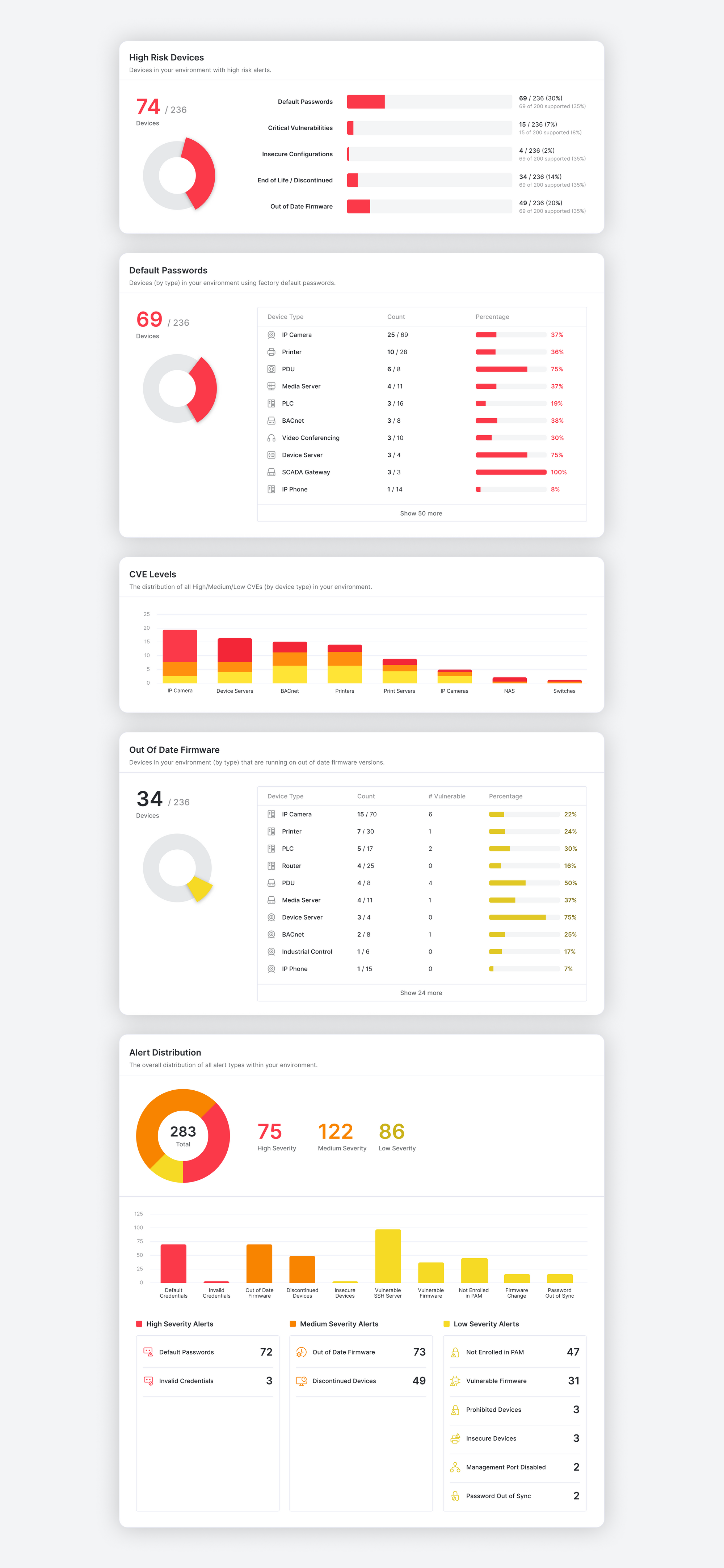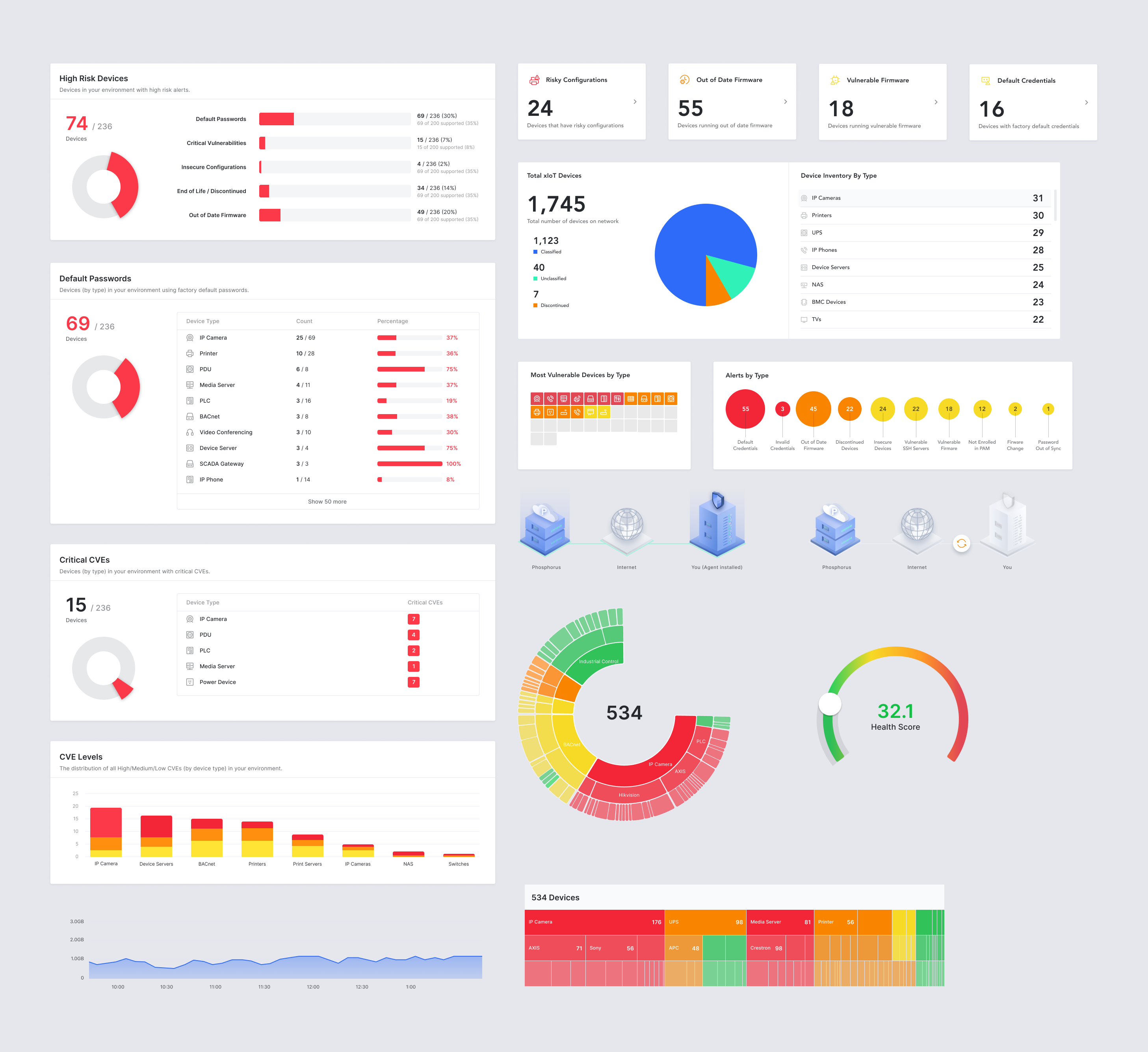 Across the enterprise, as high as 26% of all IoT devices are end-of-life and no longer supported with firmware updates by their manufacturer; and as many as 50% have known vulnerabilities or default passwords, with 20% of those vulnerabilities being critical CVEs (CVSS score of 9 or above). Some areas of focus include: