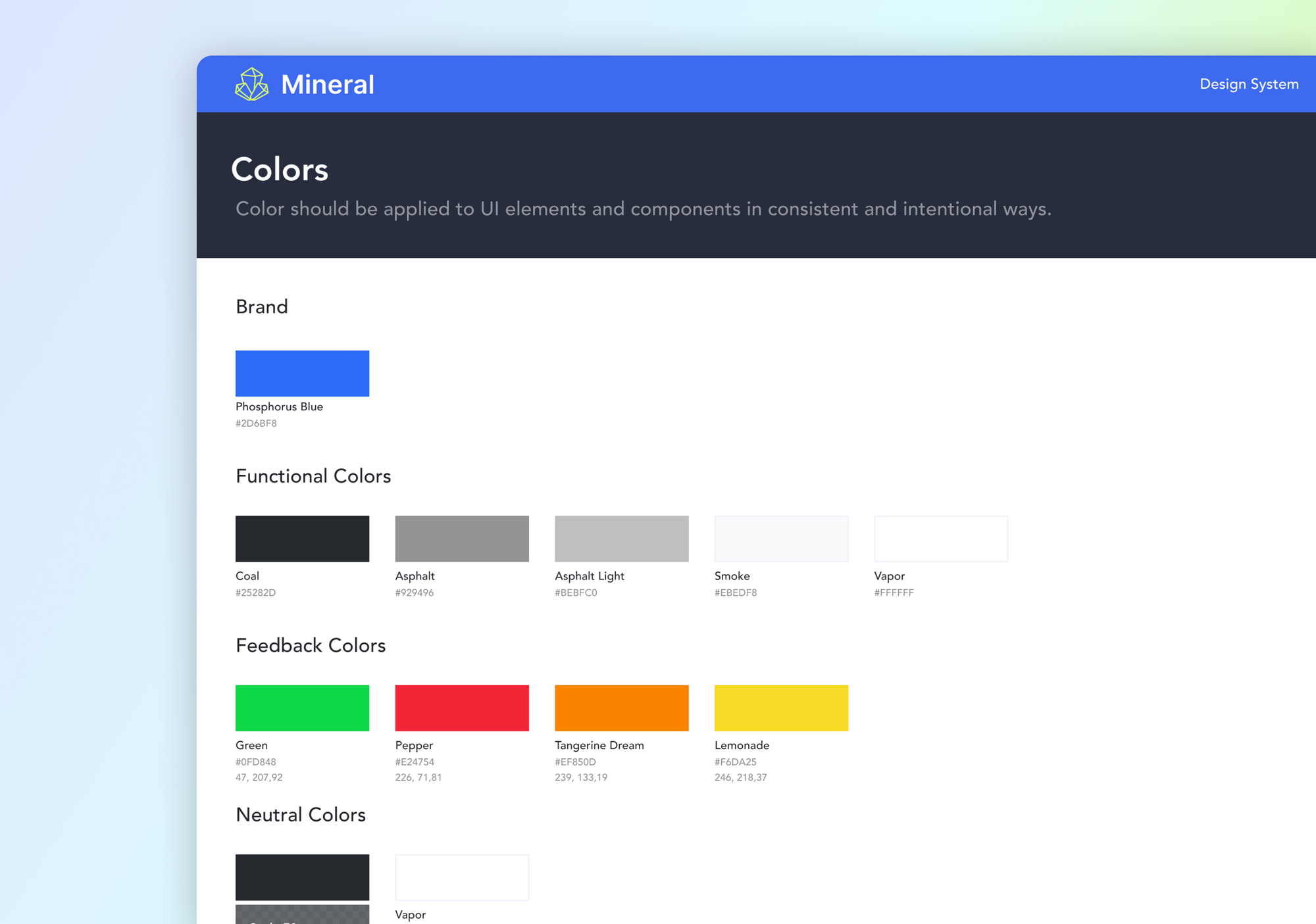 I built out a rudimentary design system (Mineral) in parallel to designing the product in order to maintain everything from iconography, fonts, colors and UI components. This speed up the process a bit and allowed me to globally update components or elements in one place which populated across the project branches.