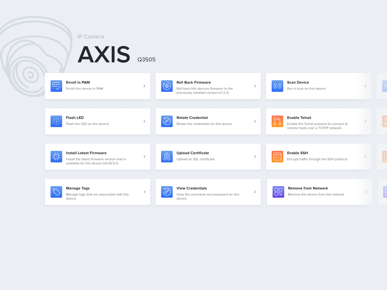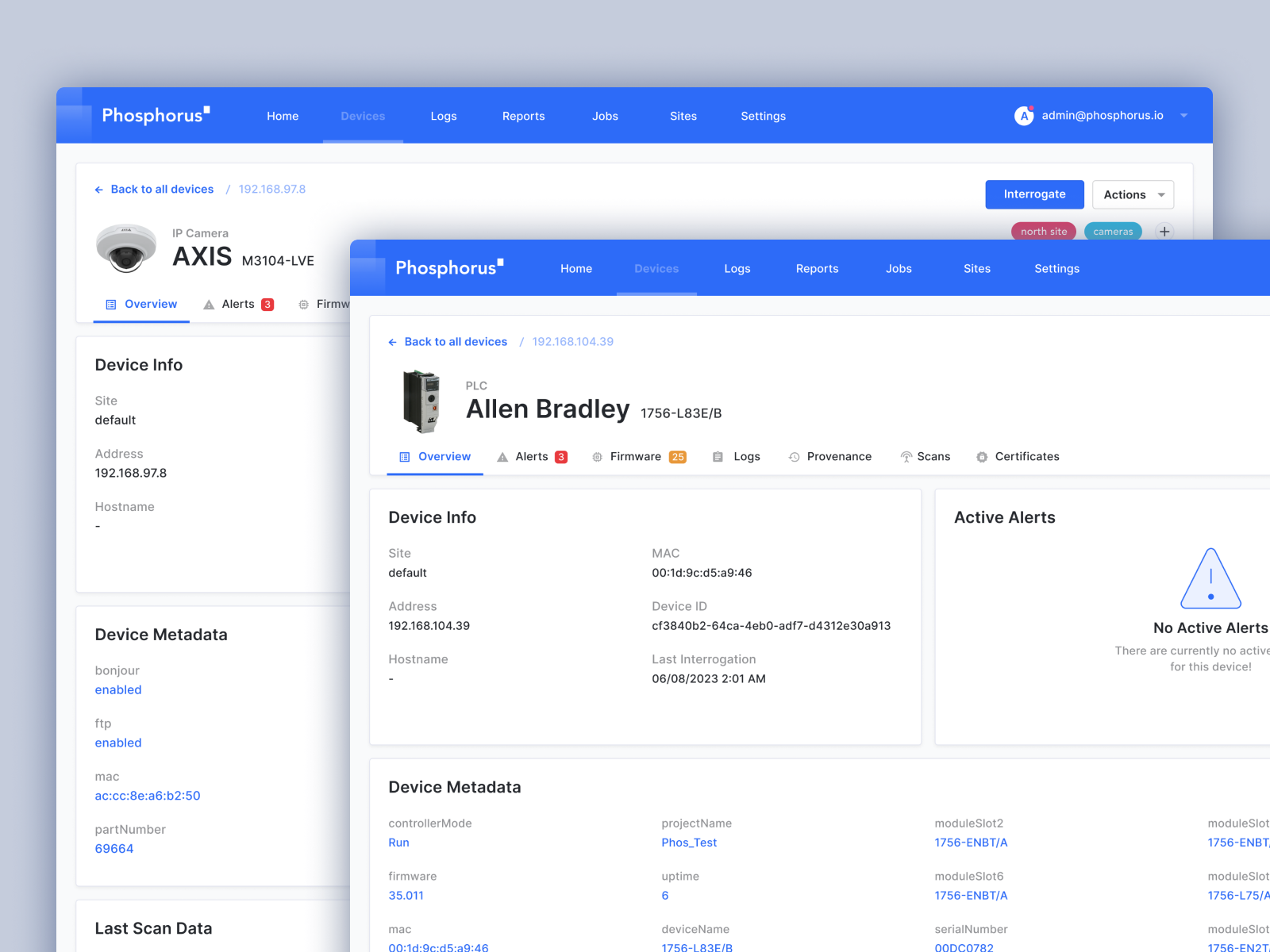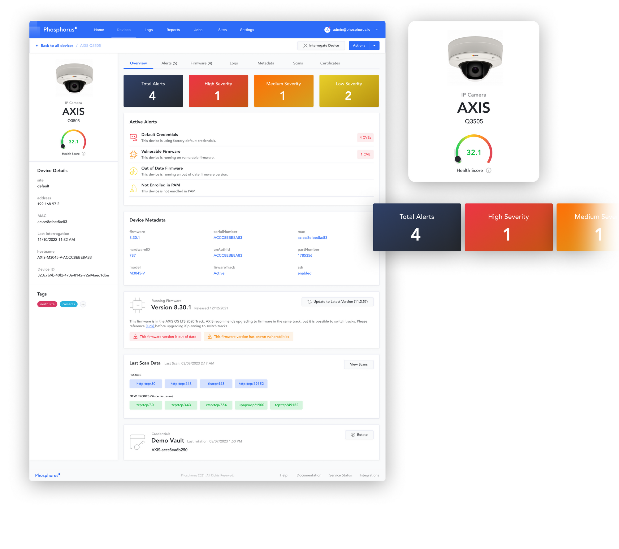Every device has a detail view that includes various data points such as the specific device detail, a health score, active alerts, device metadata, firmware version, scan and credential data.