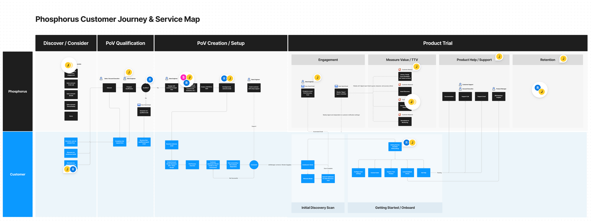 This made it much easier to have conversations with the cross-functional teams as we were able to narrow in on each stage when context was needed as well as determine the touch points of engagement with the customer (support during PoV, in product support, retention strategy, etc).