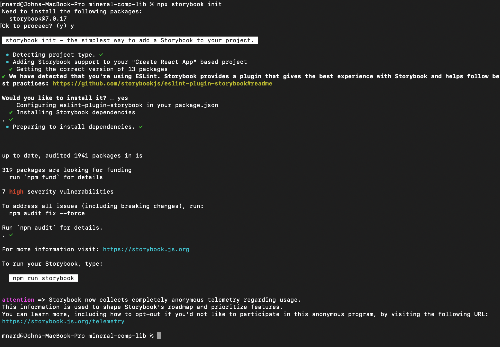 Once successfully installed, type this into the terminal to start Storybook: